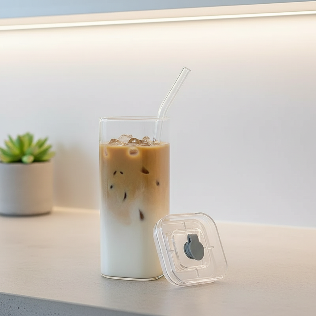 1x Square Glass Cup, 1x Glass or Bamboo Lid, 1x Reusable Glass Straw |
